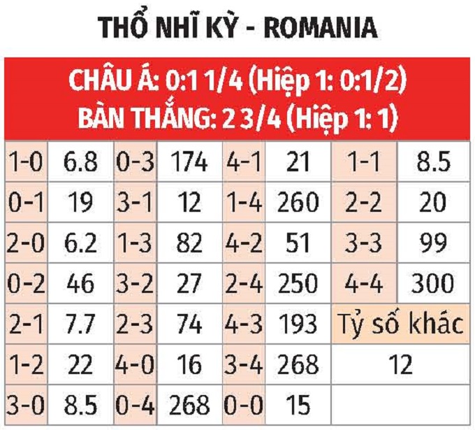 - Romania thắng châu Á hiệp 1: Lịch sử chứng kiến Romania thắng châu Á 3/4 trận gần nhất trong hiệp đầu tiên. Trên sân nhà, Thổ Nhĩ Kỳ thua châu Á 9/11 trận vừa qua trong hiệp 1. Với Romania, đội khách thắng châu Á 5 trận liên tiếp gần đây.