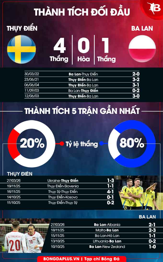 Đáng chú ý, Thụy Điển thường chiếm ưu thế trong những cuộc đối đầu giữa hai đội, thắng 7/8 trận gần nhất giữa hai đội. Tuy nhiên, chiến thắng gần đây nhất của Ba Lan, với tỷ số 2-0 ở vòng loại World Cup, là lời nhắc nhở rằng họ hoàn toàn có khả năng cạnh tranh ở cuộc đối đầu rạng sáng ngày 1/4.