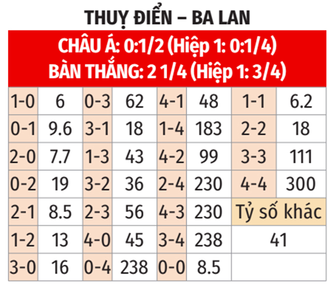 - Tối thiểu 3 bàn cả trận: 2/3 trận gần nhất của Thụy Điển, cả 2 trận gần đây của Ba Lan đều có từ 3 bàn thắng trở lên. Hơn nữa, 6/9 trận sân nhà gần đây của Thụy Điển và 5/8 chuyến làm khách vừa qua của Ba Lan cũng chứng kiến ít nhất 3 bàn cả trận.