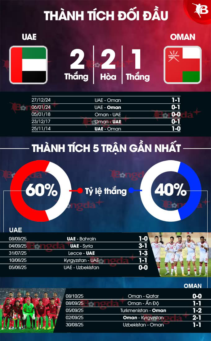 Thành tích đối đầu cũng ủng hộ UAE. Ở 5 lần giáp mặt Oman gần đây, UAE đã thắng 2, hoà 2 và chỉ thua 1. Điều này tiếp thêm động lực để đội tuyển này hướng đến 3 điểm trước Oman, dù rằng việc có được thắng lợi chung cuộc không hề đơn giản.