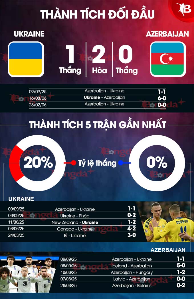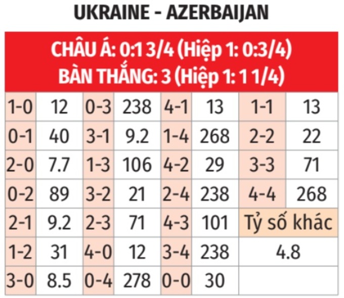 - Cả trận không quá 3 bàn: 7/9 trận đấu chính thức gần đây của Ukraine chỉ có tối đa 3 bàn thắng. Tình trạng tương tự xảy ra ở 6/7 trận vừa qua của Azerbaijan.